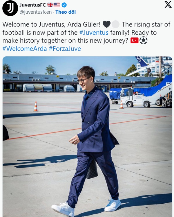 Cách đây ít giờ, Juventus bất ngờ xác nhận hoàn tất thương vụ chiêu mộ Arda Guler trên tài khoản X chính thức (phiên bản tiếng Anh): “Chào mừng đến với Juventus, Arda Guler. Tài năng trẻ hàng đầu của bóng đá thế giới đã là thành viên của gia đình Juventus. Bạn đã sẵn sàng cùng nhau tạo nên lịch sử trên hành trình mới này chưa?”, Lão bà viết chú thích kèm hình ảnh tiền vệ người Thổ Nhĩ Kỳ đặt chân xuống 1 sân bay.
