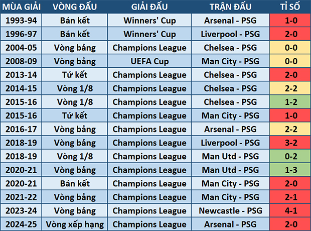 KẾT QUẢ CÁC TRẬN ĐẤU TẠI ANH TRƯỚC ĐÂY CỦA PSG Ở CÚP CHÂU ÂU