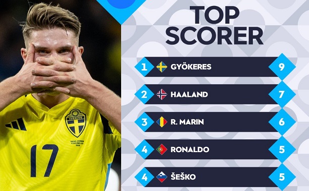 Với cú poker ở trận đấu rạng sáng nay, Gyokeres đã nâng tổng số bàn thắng ở vòng bảng Nations League 2024-25 lên con số 9. Anh đã vượt qua Erling Haaland (7 bàn), vươn lên dẫn đầu danh sách dội bom. Đứng các vị trí tiếp theo trên BXH này là Marin (Hungary - 6 bàn), Ronaldo (Bồ Đào Nha - 5 bàn) và Sesko (Slovenia - 5 bàn).
