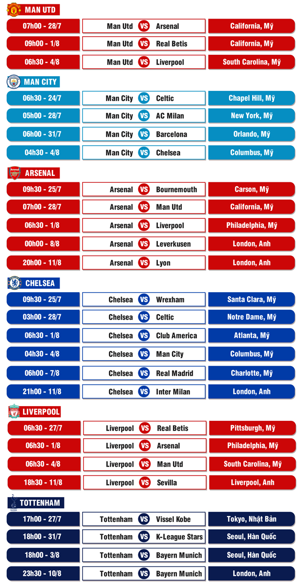 5 CLB trong nhóm “Big 6” của Premier League sẽ du đấu tại Mỹ trong quá trình chuẩn bị cho mùa giải mới 2024-25. |