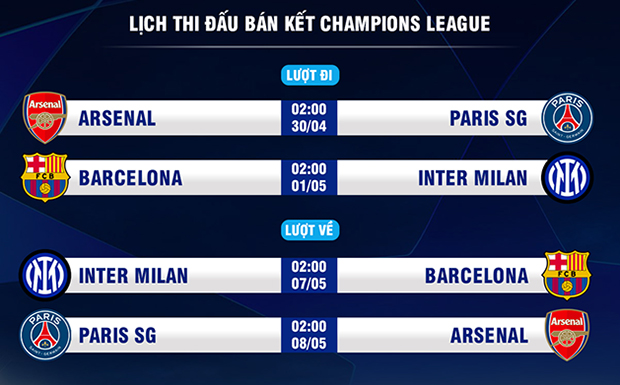 Theo lịch, 2 trận lượt đi bán kết Champions League sẽ diễn ra vào rạng sáng các ngày 30/4 và 1/5. 2 trận lượt về sẽ diễn ra sau đó 1 tuần.