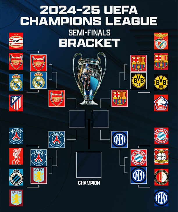Như vậy, 4 đội bóng giành vé vào bán kết Champions League mùa này là PSG, Barcelona, Arsenal và Inter Milan. Trong số này, Barcelona là đội giàu thành tích nhất với 5 chức vô địch Champions League trong quá khứ. Inter Milan cũng đã 3 lần lên ngôi trước đây. Trong khi đó, cả Arsenal và PSG đều chưa từng lên đỉnh châu Âu.