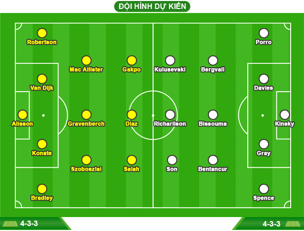 Ngoài phong độ và sân bãi, Liverpool còn nắm lợi thế lớn về lực lượng. The Reds sẽ bước vào trận đấu này với đội hình tối ưu và chỉ vắng mặt duy nhất Joe Gomez. Trong khi đó, đội hình của Spurs vẫn đang bị tàn phá nặng nề vì chấn thương. Trung vệ Radu Dragusin là cái tên mới nhất gia nhập danh sách bệnh binh của đội bóng Bắc London, gồm Destiny Udogie, Guglielmo Vicario, Brennan Johnson, Wilson Odobert, Timo Werner, Cristian Romero và Dominic Solanke.
