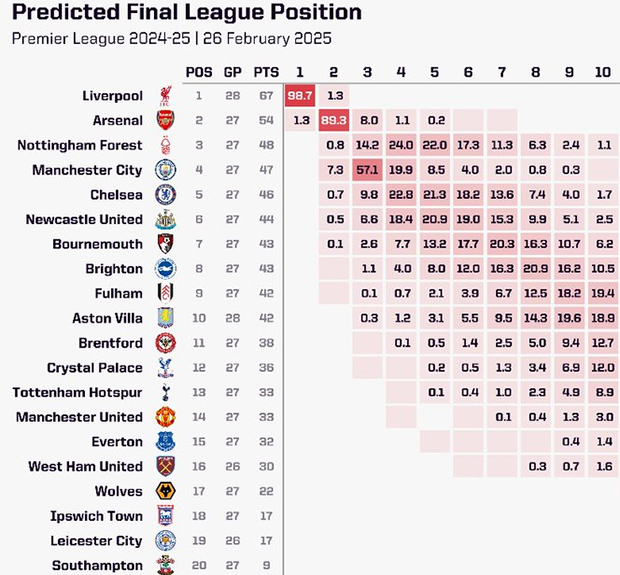 Theo phần mềm giả lập của Opta, cuộc đua vô địch Premier League 2024-25 coi như đã ngã ngũ bởi cơ hội giành chức vô địch của Liverpool đã đạt ngưỡng gần như tuyệt đối (98,7%). Trong khi đó, Arsenal chỉ còn vỏn vẹn 1,3% hi vọng cạnh tranh.