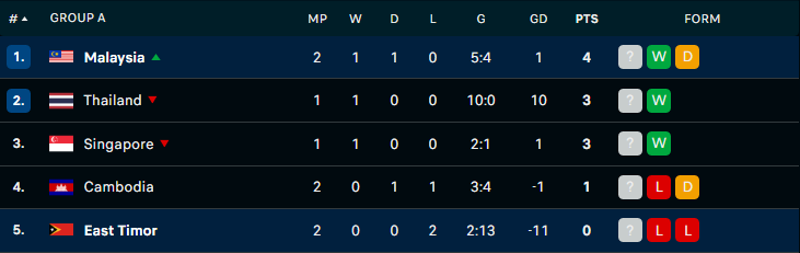 Đẳng cấp cao hơn và được chơi trên sân nhà nhưng Malaysia suýt thua vì có thời điểm bị Timor Leste dẫn 2-1. Sau 90 phút nhọc nhằn, Hổ vàng thắng chung cuộc 3-2, qua đó tạm thời đứng đầu bảng A. |