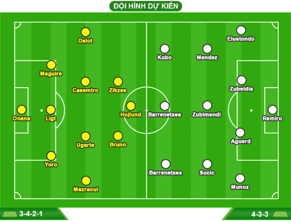 - REAL SOCIEDAD: Vắng Jon Pacheco và Arsen Zakharyan (chấn thương). Khả năng ra sân Luka Sucic, Jon Aramburu và Alvaro Odriozola còn bỏ ngỏ.