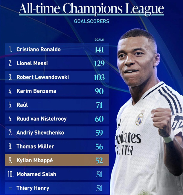 Mbappe lọt top 10 chân sút vĩ đại nhất lịch sử UCL |