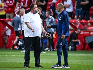 Chủ sở hữu Nottingham, Evangelos Marinakis đã xuống tận sân chất vấn HLV Nuno Santo sau khi đội bóng bị Leicester cầm hòa. |