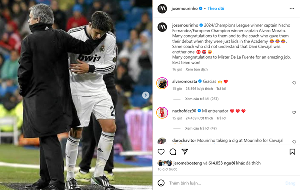 HLV Jose Mourinho dí dỏm cho rằng mình đã góp sức giúp Tây Ban Nha vô địch EURO 2024 khi cho bộ đôi Morata - Nacho ra mắt ở Real Madrid. |