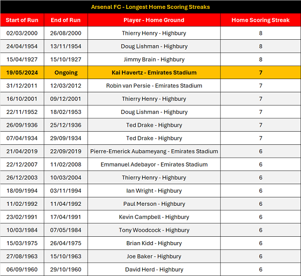 Người gần nhất làm được điều này cho Arsenal là Robin van Persie (năm 2012). Chỉ Thierry Henry, Doug Lishman và Jimmy Brain có chuỗi ghi bàn trên sân nhà dài hơn cho Arsenal, mỗi người 8 trận.