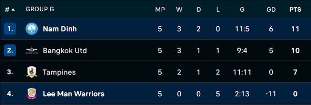 Dễ dàng thắng Lee Man 3-0, Nam Định đã vươn lên dẫn đầu bảng G AFC Champions League 2 sau lượt trận thứ 5. Thầy trò HLV Vũ Hồng Việt đã chính thức đoạt vé vòng 1/8 sớm vì hơn đội xếp thứ 3 Tampines 4 điểm trong khi chỉ còn 1 lượt trận.