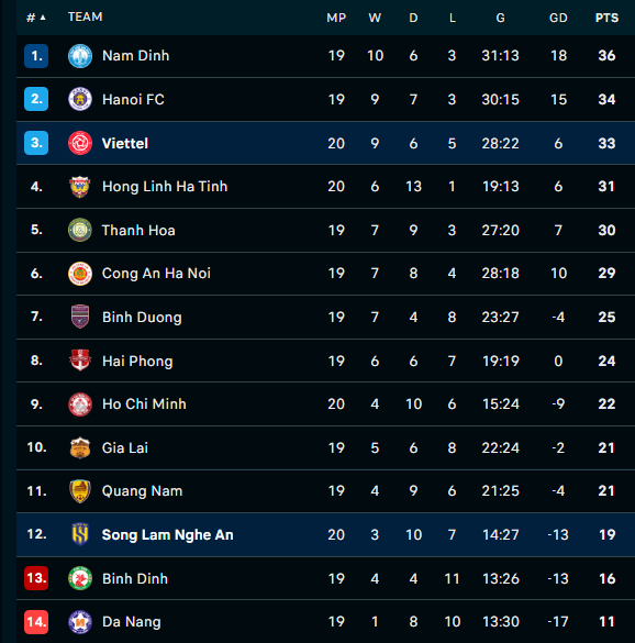 Sau 3 trận liên tiếp chỉ hòa và thua, Viettel đã trở lại quỹ đạo chiến thắng khi đánh bại SLNA 1-0 ở vòng 20 V-League. Với chiến thắng này, Viettel đã tạm rút ngắn khoảng cách với Nam Định xuống còn 3 điểm. |