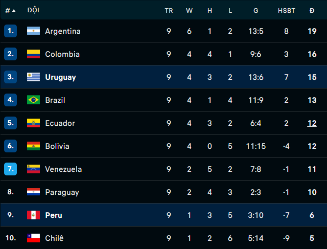 ![]() Trước trận tiếp Uruguay, Peru đứng cuối bảng vòng loại World Cup 2026 khu vực Nam Mỹ với 3 điểm sau 8 trận ![]() Uruguay tung đội hình mạnh với sơ đồ 3-5-2. Darwin Nunez đá cặp tiền đạo với cầu thủ đang thi đấu ở MLS, Cristian Olivera ![]() Được đánh giá vượt trội nhưng trong ngày Nunez mờ nhạt vì bị 'chăm sóc' đặc biệt, hàng công của Uruguay thực sự bế tắc ![]() Luôn có khoảng 2 cầu thủ sẵn sàng đeo bám mỗi khi tiền đạo của Liverpool có bóng trong chân ![]() Cầm bóng tới 63% nhưng Uruguay lại tạo ra số cơ hội ít hơn Peru ![]() Rơi vào thế không còn gì để mất, Peru thi đấu quyết liệt ở khắp mặt sân ![]() Hậu vệ Miguel Araujo trong một pha dâng cao dứt điểm rất nguy hiểm ![]() Khi tất cả đã nghĩ về một kết quả hòa không bàn thắng thì bất ngờ đã xảy ra... ![]() Miguel Araujo đã hóa người hùng, đánh đầu tung lưới Rochet ở phút 88 ![]() Bàn thắng ở những phút cuối trận đã mang lại cảm xúc vỡ òa rất đặc biệt cho cả cầu thủ và CĐV đội chủ nhà ![]() Chiến thắng này sẽ xốc lại tinh thần cho Peru trong chiến dịch vòng loại World Cup ![]() 'Phù Thủy' Bielsa bất lực trong thế trận mà Peru tỏ rõ quyết tâm và khao khát chiến thắng hơn Uruguay. Thua trận này, Uruguay bỏ lỡ cơ hội vươn lên top 2 KẾT QUẢ LƯỢT TRẬN THỨ 9 VÒNG LOẠI WORLD CUP 2026 KHU VỰC NAM MỸ