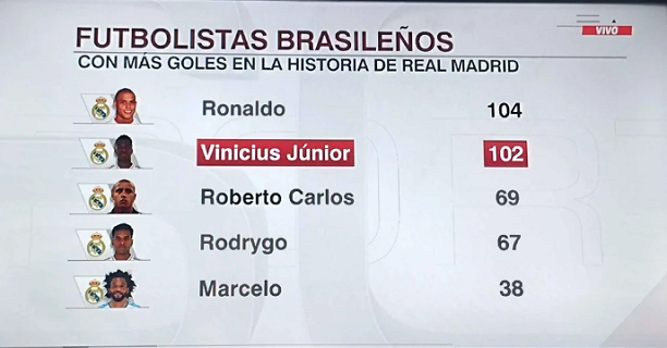 Cho tới hiện tại, Ronaldo de Lima vẫn là cầu thủ Brazil ghi nhiều bàn nhất cho Real Madrid. Nhưng vị trí của Rô béo đang bị đe dọa bởi hậu bối Vinicius. Bàn ấn định tỉ số 2-0 trước Girona vào rạng sáng nay là pha lập công thứ 102 của Vinicius trên mọi đấu trường cho Kền kền trắng.