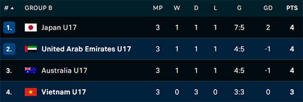Ở trận đấu còn lại của bảng đấu này, U17 Australia đã đánh bại Nhật Bản với tỉ số 2-3. Cả Nhật Bản, UAE và Australia đều giành 4 điểm nhưng Nhật Bản và UAE giành vé tham dự World Cup nhờ hơn thành tích đối đầu. Trong khi đó, U17 Việt Nam đứng cuối bảng với 3 điểm.