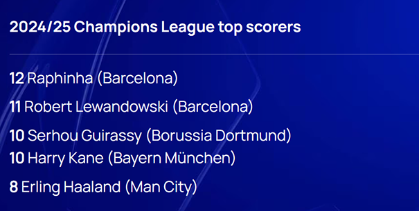 Còn nhớ ở mùa 2011-12, Messi đã đoạt danh hiệu Vua phá lưới UCL. Trong khi đó, ở mùa giải này, Raphinha đang dẫn đầu cuộc đua Vua phá lưới giải đấu danh giá nhất châu Âu. Ngoài ra, tuyển thủ Brazil còn đang dẫn đầu danh sách kiến tạo. Cần biết rằng, Raphinha là cầu thủ đầu tiên trong lịch sử ghi từ 10 bàn trở lên và có hơn 5 kiến tạo trong 1 mùa giải tại Champions League.