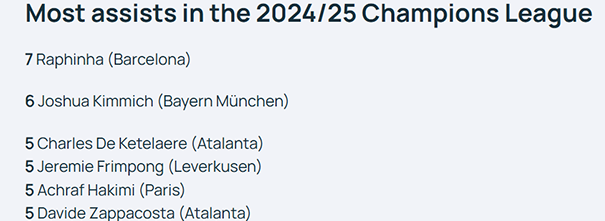 Tính cả một bàn thắng và hai kiến tạo trước Dortmund, Raphinha đã góp dấu giày trực tiếp (ghi bàn và kiến tạo) vào 19 bàn thắng tại Champions League 2024-25. Đến thời điểm này, ngôi sao 28 tuổi đã ghi 12 bàn và có 7 kiến tạo.