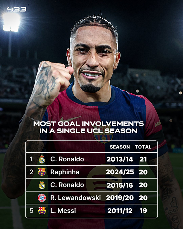 Tỏa sáng trong trận hòa 3-3 giữa Barcelona và Inter Milan ở lượt đi vòng bán kết Champions League, Raphinha không chỉ vượt qua thành tích ghi bàn và kiến tạo của Lionel Messi mà còn tiến gần đến kỉ lục của Cristiano Ronaldo tại đấu trường danh giá này. |
