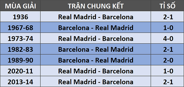 Đây là lần thứ 8 trong lịch sử Real Madrid và Barca gặp nhau ở chung kết cúp Nhà Vua Tây Ban Nha. Kền kền đang tạm nắm ưu thế với 4 chiến thắng. |