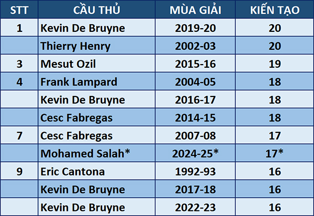 Trong kỉ nguyên Premier League, 2 cầu thủ đang nắm giữ kỉ lục về số kiến tạo trong 1 mùa giải là Kevin De Bruyne (2019-20) và Thierry Henry (2002-03). Cả 2 đều kiến tạo 20 bàn thắng, chỉ hơn 3 kiến tạo so với thành tích hiện tại của Mohamed Salah.
