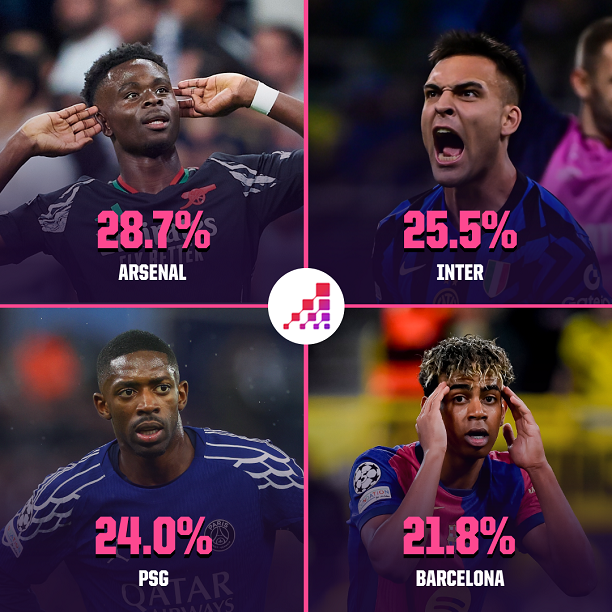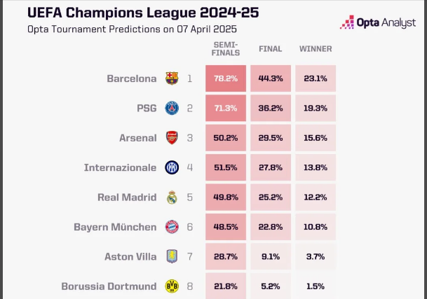 ![]() Arsenal thắng thuyết phục Real Madrid Vòng tứ kết Champions League 2024-25 đã khép lại vào rạng sáng nay, với 4 đội đã giành quyền đi tiếp là Arsenal, PSG, Inter Milan và Barcelona. Kết quả này trùng với dự đoán của Opta trước khi diễn ra lượt đi tứ kết. Ở thời điểm đầu, Opta dự đoán Barca và PSG là 2 ứng cử viên hàng đầu cho chức vô địch Champions League mùa này. Tuy nhiên, Arsenal đã vươn lên trở thành ứng cử viên số 1 sau khi xuất sắc hạ Real Madrid với tổng tỉ số 5-1 ở tứ kết. Dựa trên kết quả tứ kết, các chỉ số chuyên môn, đối thủ ở bán kết và nhiều yếu tố khác, Siêu máy tính của Opta dự đoán Arsenal có 28,7% cơ hội giành chức vô địch Champions League đầu tiên, cao hơn 3 đội còn lại ở vòng bán kết. Tương tự Arsenal, đối thủ của họ ở bán kết, PSG cũng đang rất quyết tâm giành chiếc cúp tai voi đầu tiên trong lịch sử CLB. Nhưng đoàn quân của Luis Enrique chỉ là ứng cử viên số 3 với cơ hội lên ngôi là 24%. PSG thực tế đã suýt bị Aston Villa ngược dòng dù thắng 3-1 ở lượt đi. ![]() Dự đoán của Opta trước loạt trận tứ kết Đáng chú ý, Barca dù dễ dàng hạ Dortmund ở tứ kết và đang dẫn đầu La Liga nhưng chỉ là ứng cử viên thứ 4 cho chức vô địch Champions League. Đoàn quân của Hansi Fick có 21,8% cơ hội lên ngôi. Đối thủ của họ ở bán kết, Inter Milan có 25,5% lên ngôi sau 15 năm chờ đợi. Trong 4 đội vào bán kết, Arsenal đã từ bỏ cuộc đua ở Premier League để tập trung hoàn toàn cho đấu trường danh giá nhất châu Âu, còn PSG đã sớm lên ngôi vô địch Ligue 1 nhưng còn bận tâm về trận chung kết cúp Quốc gia. Hai cái tên còn lại, Inter Milan và Barca đều đang căng sức ở giải đấu quốc nội. ![]() Cơ hội vô địch của 4 đội vào bán kết |