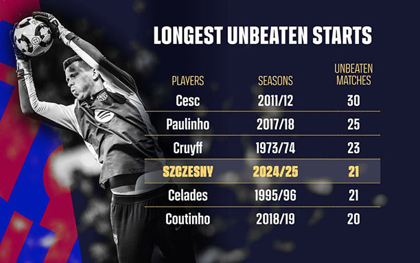 Szczesny lọt top cầu thủ bất bại dài nhất tại Barca |