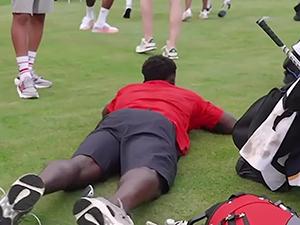 Ngã sấp mặt vì vấp phải túi gậy golf, Saka biến mình thành trò cười cho các đồng đội ở tuyển Anh. |