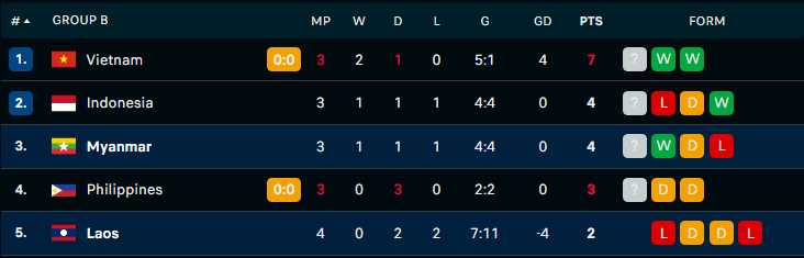 Được đánh giá cao hơn cùng lợi thế sân nhà nhưng Myanmar chật vật vượt qua Lào với tỉ số 3-2. Với chiến thắng này, Myanmar tiếp tục nuôi hi vọng mong manh vào bán kết ASEAN Cup 2024. |