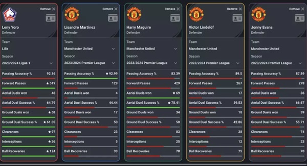 Trong 5 người, Yoro là người thực hiện nhiều đường chuyền về phía trước nhất (519 đường chuyền). Trong khi đó, Harry Maguire là người giỏi nhất khi nói đến các cuộc đấu tay đôi trên không, với 69 lần chiến thắng (tỉ lệ 78,41%).