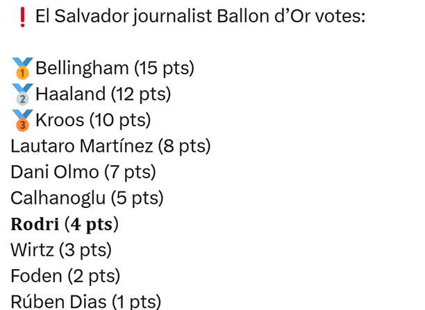 ![]() Vinicius về nhì sau Rodri Rạng sáng nay (29/10), Rodri đã vượt qua Vinicius để giành QBV 2024. Đây là sự kiện gây bất ngờ lớn bởi trước khi gala ‘bóng vàng’ diễn ra, gần như tất cả đều tin rằng chủ của giải thưởng này năm nay là Vinicius. Thậm chí, hôm qua, Marca - tờ báo thân Real, đã khẳng định 100% tuyển thủ Brazil sẽ được tôn vinh. Về phía Real Madrid, vì tự tin Vinicius sẽ giành giải nên đội bóng TBN đã cử phái đoàn hùng hậu gồm 50 người do chủ tịch Perez dẫn đầu đến Paris. Tuy nhiên, vào phút chót Real Madrid đã hủy chuyến đi đến Pháp, tẩy chay lễ trao QBV vì biết tiền đạo 24 tuổi hụt giải. Theo kết quả bình chọn, Vinicius về nhì sau Rodri, trong khi Bellingham cán đích thứ ba. Theo kế hoạch, vào ngày 9/11 tới, France Football sẽ công bố chi tiết kết quả bình chọn. Tuy nhiên, truyền thông Tây Ban Nha đã tiết lộ một số thông tin thú vị liên quan đến những lá phiếu khó hiểu dành cho Vinicius. Theo kênh El Chiringuito TV, một nhà báo El Salvador thậm chí không bình chọn cho Vinicius. Ngạc nhiên hơn, người này đã loại ngôi sao Real Madrid khỏi top 10, dù trước đó, trên MXH, đã khen Vinicius là cầu thủ xuất sắc nhất thế giới sau trận Los Blancos thắng Dortmund 5-2 tại Champions League. Đánh giá Vinicius cao hơn đồng nghiệp người El Salvador, một nhà báo Albania điền tên Vinicius ở vị trí thứ 8. Người này đã bầu lá phiếu cao nhất cho Rodri, thứ hai cho Yamal và thứ ba cho Carvajal. Trong khi đó, nhà báo Croatia và nhà báo Ukraine chọn Vinicius ở vị trí thứ tư. Mất điểm ở những lá phiếu khó hiểu trên là một trong những nguyên nhân khiến Vinicius bất ngờ thua Rodri trong cuộc tranh đua danh hiệu năm nay. Trước đó, Vinicius tự tin đoạt giải đến mức đã tổ chức buổi lễ ăn mừng tại nhà riêng ở Madrid. Bất bình vì Vinicius hụt giải, nhiều ngôi sao, cựu sao Real, cầu thủ và cựu cầu thủ Brazil đã công khai bày tỏ sự tức giận trên MXH. Về phía Real, Los Blancos đã cáo buộc UEFA nhúng tay vào kết quả bình chọn, khiến Vinicius thất bại cay đắng. Lá phiếu của nhà báo người El Salvador ![]() |