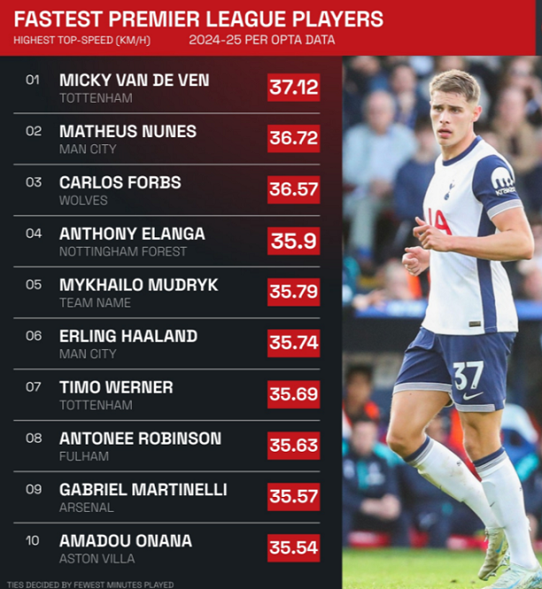 Vua tốc độ của Premier League lúc này là Micky van de Ven của Tottenham. Hậu vệ đa năng người Hà Lan đạt vận tốc cao nhất 37,12 km/h. Từ đầu mùa, Van de Ven đã đóng góp cho Spurs 2 kiến tạo ở Ngoại hạng Anh, trong đó có pha dốc bóng từ sân nhà sang cầu môn đối phương trước khi dọn cỗ cho đồng đội ghi bàn ở trận thắng M.U 3-0.