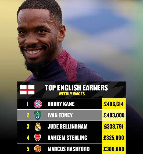 Toney chỉ kém một chút so với cầu thủ Anh hưởng lương cao nhất là Harry Kane. Đội trưởng Tam sư sau khi rời Tottenham gia nhập Bayern Munich vào mùa hè năm ngoái đã kiếm được 406 nghìn bảng/tuần. Nhưng theo truyền thông Saudi Arabia, ngoài lương cứng, Toney còn nhận được các khoản thưởng hậu hĩnh tùy thuộc vào thành tích. Tổng thu nhập của cựu sao Brentford có thể lên tới 500 nghìn bảng/tuần.