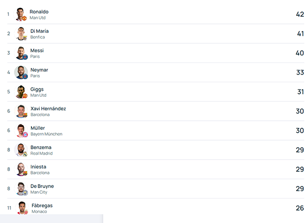 Tỏa sáng ở trận Benfica thắng AS Monaco, Angel di Maria đã vượt qua Leo Messi, đồng thời áp sát Cristiano Ronaldo trong top vua kiến tạo Champions League. |