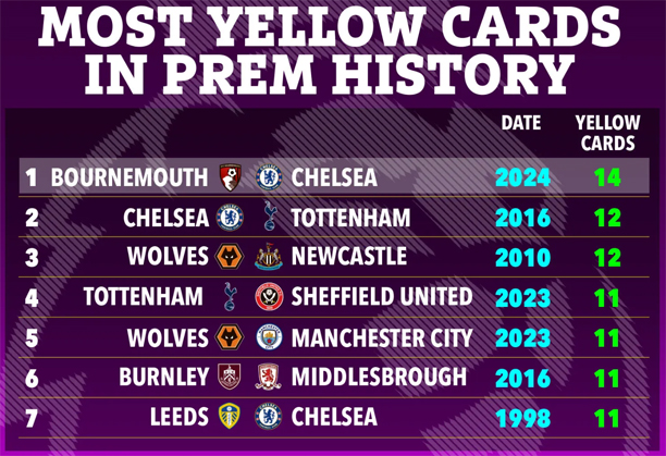 Trọng tài Anthony Taylor đã lập kỉ lục khi rút tổng cộng 14 chiếc thẻ vàng ở trận đấu giữa Bournemouth và Chelsea. |