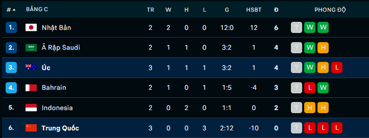 Trung Quốc vẫn chưa giành điểm sau 3 lượt trận ở vòng loại thứ 3 World Cup 2026, trong khi Indonesia đã tích lũy 2 điểm và đá ít hơn 1 trận. |