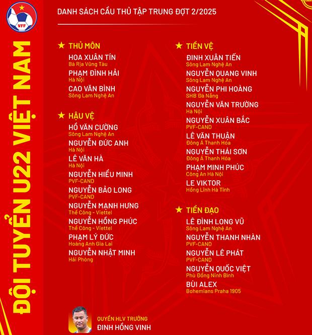 Chiều nay (22/5), song hành với ĐTQG, LĐBĐ Việt Nam (VFF) đã công bố danh sách tập trung tuyển U22 Việt Nam. Tổng cộng 26 cầu thủ đã được điền tên vào danh sách triệu tập. Trong đó, điểm nhấn đáng chú ý nhất là sự góp mặt của tiền đạo Alex Bùi.
