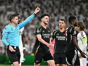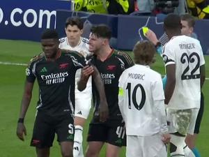 Declan Rice nổi nóng sau khi Thomas Partey nhận thẻ vàng không đáng có ở trận thắng Real Madrid tại Bernabeu. |