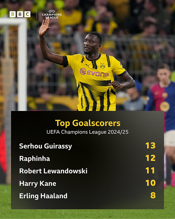 Tiền đạo của Dortmund, Serhou Guirassy, đã thiết lập năm cột mốc ghi bàn ấn tượng tại Champions League khi chọc thủng lưới Barcelona ba lần trong trận tứ kết lượt về. |
