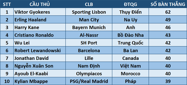 ![]() Xuân Son đứng thứ 8 về số bàn thắng trong năm 2024 (tính cả cấp độ CLB và ĐTQG) Năm 2024 là năm đấu “đại cát” của Nguyễn Xuân Son bởi anh đã thể hiện phong độ săn bàn rất ấn tượng trong màu áo Nam Định. Cùng với chức vô địch V-League, tiền đạo này đã lập kỉ lục với 31 bàn thắng. Cuối năm 2024, sau khi hoàn tất thủ tục nhập tịch, Xuân Son đã ra mắt ĐTQG Việt Nam rất ấn tượng với 5 bàn thắng sau 3 lần ra sân ở ASEAN Cup. Tính tổng số bàn thắng trên mọi đấu trường ở cả cấp độ CLB và ĐTQG, Xuân Son đã ghi 40 bàn trong năm 2024. Theo thống kê của SportMail, đây là 1 trong 10 tiền đạo đạt thành tích ghi bàn xuất sắc nhất năm. Dẫn đầu BXH này là Viktor Gyokeres. Trong năm đấu vừa qua, tiền đạo người Thụy Điển đã ghi 62 bàn/63 trận, trong đó có 52 bàn thắng cho Sporting Lisbon. Đây cũng là chân sút đang tạo sức hút đặc biệt trên thị trường chuyển nhượng. ![]() Gyokeres là chân sút xuất sắc nhất năm 2024 với 62 bàn Với 62 bàn, Gyokeres bỏ khá xa người xếp thứ 2 là Erling Haaland (49 bàn). Trong khi đó, Harry Kane chỉ xếp thứ 3 với 46 bàn dù thể hiện phong độ săn bàn khá ổn định trong màu áo Bayern Munich và ĐT Anh. Trong năm 2023, Cristiano Ronaldo là chân sút xuất sắc nhất thế giới với 54 bàn. Nhưng trong năm 2024, CR7 chỉ ghi 43 bàn, đứng thứ 4 trên BXH. Trong khi đó, tiền đạo xuất sắc nhất năm 2022 (56 bàn), Kylian Mbappe chỉ đứng thứ 10 với 39 bàn, xếp sau cả Xuân Son. Ngoài ra, 4 chân sút khác cũng lọt top 10 là Wu Lei, Robert Lewandowski (42 bàn), Jonathan David và Ayoub El-Kaabi (40 bàn). ![]() |