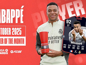 Cùng ngày được trao danh hiệu Chiếc giày vàng châu Âu 2025, Mbappe tiếp tục nhận thêm giải thưởng Cầu thủ xuất sắc nhất La Liga tháng 10.